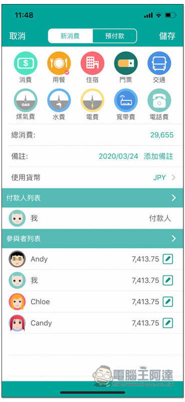 輸入總消費以及確定參與者有誰之後,下方就會自動計算每個人需要付的費用,按右上角儲存: