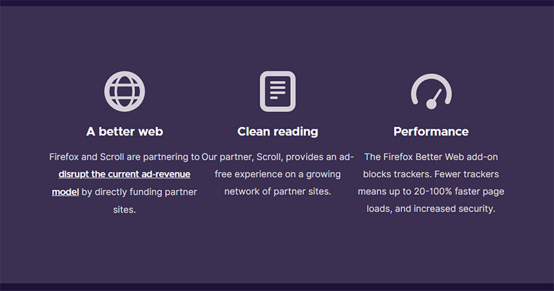 在過去 Scroll 就以每月 5 美元提供阻止廣告在某些網站上呈現的服務,Mozilla 與 Scroll 正式宣布合作,作為 Firefox 打擊網路追蹤的一部份,與原本略有不同的是在這個新推出的擴展外掛 「 Firefox Better Web 」裡包含了註冊 Scroll 的選項。實質上這項新合作就是將 Scroll 內建到 Mozilla 瀏覽器中,目的是用來了解 Firefox 能在多大程度上阻止追蹤器和其他不法行為,乃至於完全阻止廣告,而不造成網頁的破壞。