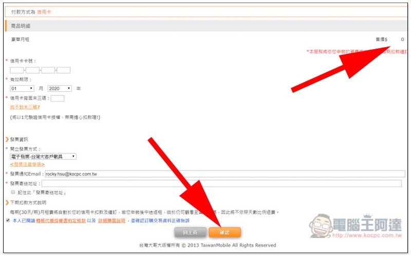 會讓你確認先前填寫的信用卡資訊,沒問題就按確認: