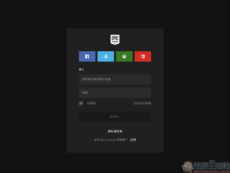 接著需要先登入 EPIC Games 帳號,如果沒有 EPIC Games 帳號的人除了可點選畫面下方免費註冊,也能直接連結 Facebook 等遊戲平台帳戶,進行快速申請帳號方式再登入: