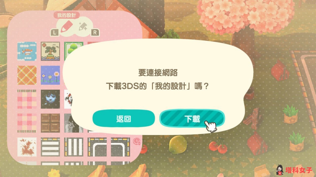 如果你是用服飾店輸入 ID 的話可略過這個步驟,若你是使用 QR Code 掃描的話,需要叫出遊戲內的「手機」,然後選擇「我的設計」,再點控制器上的「+」就能下載設計囉。