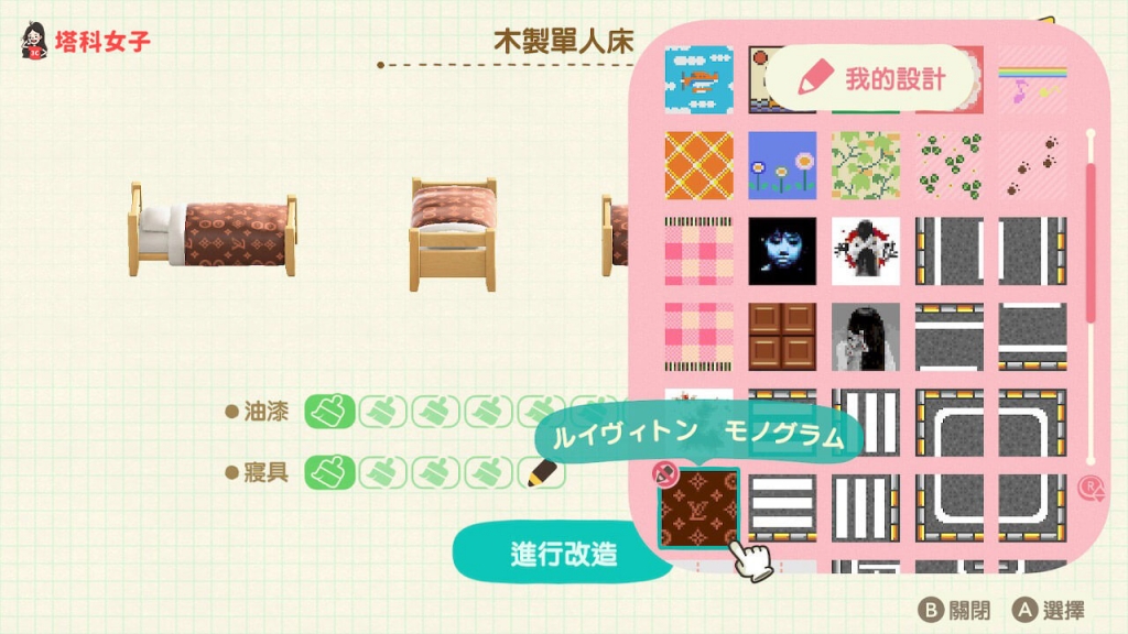 選擇你要改造的家具,我這次以木製單人床當範例。選好後在「寢具」的選項,點選「我的設計」。