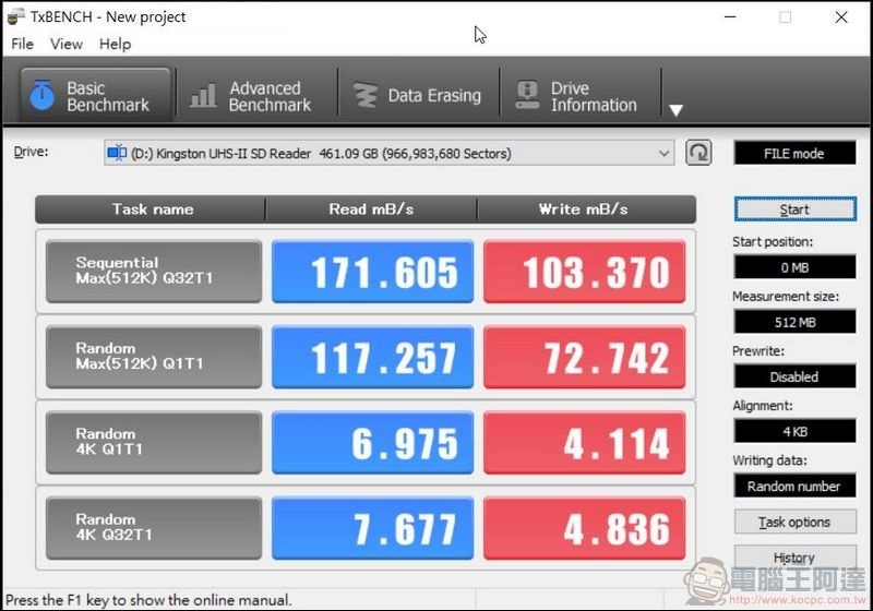 用 TxBENCH 實測,在三次測速中最快的表現速度為 171.6MB/s讀取、103.3MB/s寫入,隨機有比沒使用轉卡時差一點點,也是算誤差範圍的表現,個人的結論是轉卡對高速記憶卡的讀寫幾乎沒太大影響: