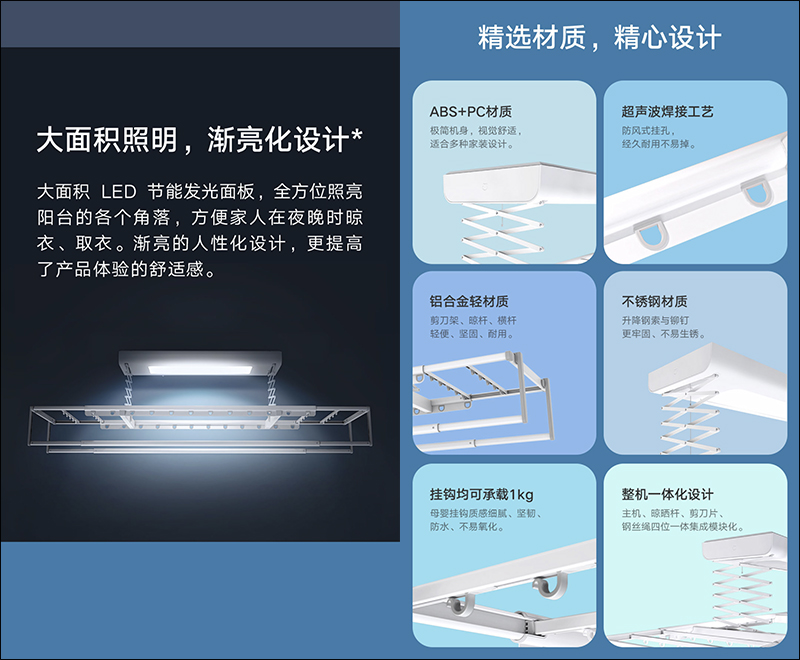 搭配大面積 LED 節能發光面板,能方便使用者在夜間晾衣、取衣的時候能有更明亮的環境。材質方面則分別以 ABS、PC 、鋁合金和不鏽鋼材質打造。