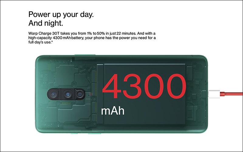 OnePlus 8 內建 4,300mAh 電池,雖未支援無線充電,但一樣提供 30W 的 Warp Charge 30T 有線閃充,可在 22 分鐘將電量從 1% 充至 50% 。