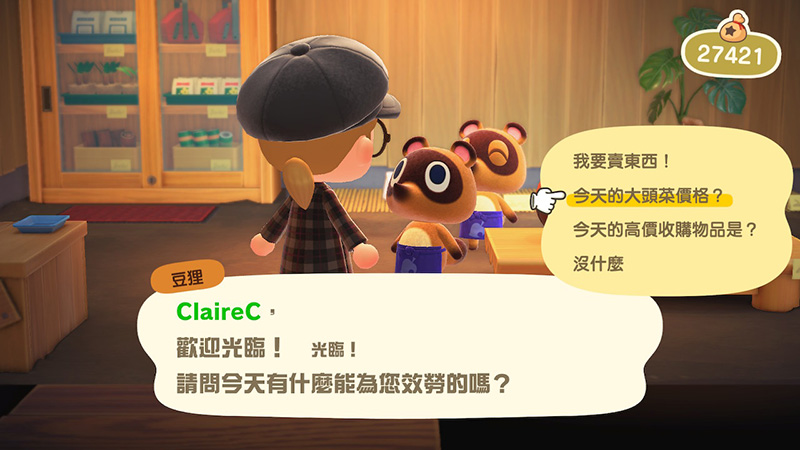 從星期一至星期六,可以到 Nook 商店向狸克詢問買收價,早上跟下午報價不同,雖然狸克經常報出低得嚇人的價格(畢竟是壟斷的行當),一日兩次可得勤跑,天曉得哪天會有漂亮的高價出現讓你一本萬利。