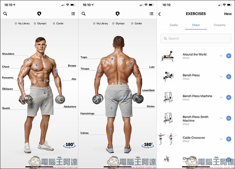 另外,範例也會將該動作能鍛鍊到的肌肉進行標記,即便看不懂英文也不擔心。假如用戶想將該動作加入自身的健身課表,只要點選「+」即可添加: