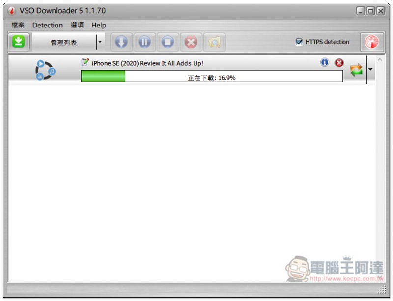 VSO Downloader 的介面我個人覺得設計有點陽春,感覺很像是好幾年前的產物。無論如何,能正常下載影片、音樂就好。開始使用前,建議把右上角 HTTPS detection 暫時關閉,如果你沒關閉,不論瀏覽什麼網頁,只要偵測到有影片可以下載,它就會自動下載,有的沒的影片都會被下載下來: