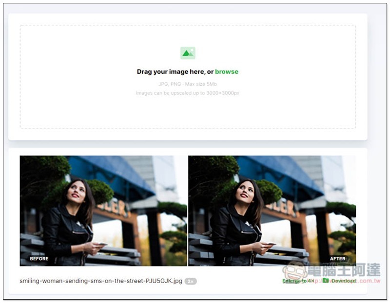 如果滿意的話,可以按右下角的下載 Download 按鈕。點擊 Enlarge to 4x 可再放大到 4 倍: