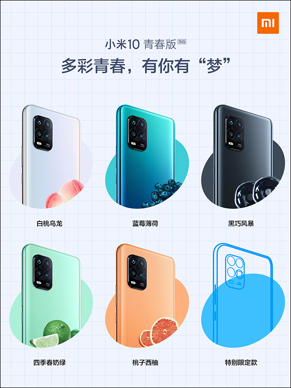 小米10 青春版共將推出多款配色並以茶飲為各款顏色命名,分別為「白桃烏龍」、「桃子西柚」、「四季春奶綠」、「藍莓薄荷」、「黑巧風暴」以及一款未公開的特別限定款配色,而這隱藏配色傳聞將是這次聯名合作的「哆啦A夢」限定款。