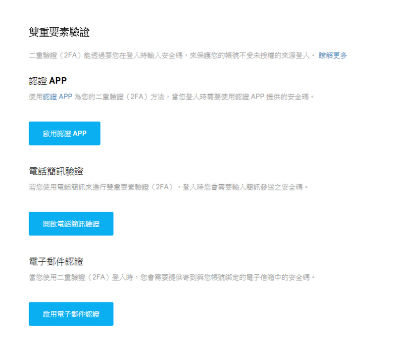 3. 捲到下面就可以看到雙重要素驗證的選項。Epic Games Store 共提供三種驗證方式,你可以選擇最適合自己的方式來使用。