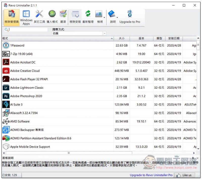 接著就會自動掃描你電腦裡已安裝的軟體,而且不只是檔案大小,連軟體版本、類型、安裝日期、公司等資訊都有:
