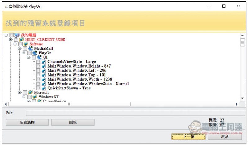 接著畫面就會顯示找到的殘留矽統登錄項目,你可以先瀏覽一遍,看有沒有什麼可能誤判的項目,如果沒有,可點選左下角全部選擇,來打勾全部,按下一個就會開始刪除: