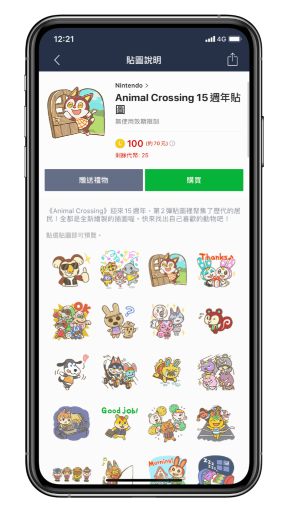 這款 Animal Crossing 貼圖是會動的,只要 60 元就能入手。看到後我直接手刀購買,西斯惠太可愛了 XD 裡面還有狸克、商店的豆狸、博物館館長、貓頭鷹妹妹還有帥氣的歌王 KK 等等。