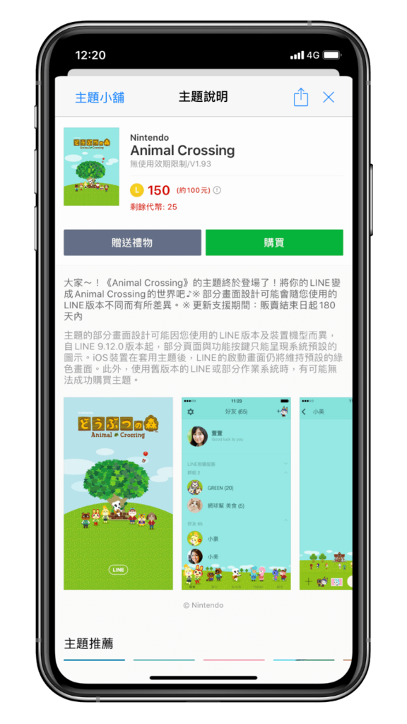 這款動森的 LINE 主題以綠色為主題,搭配可愛的島民動物們,價格大約 100 元。