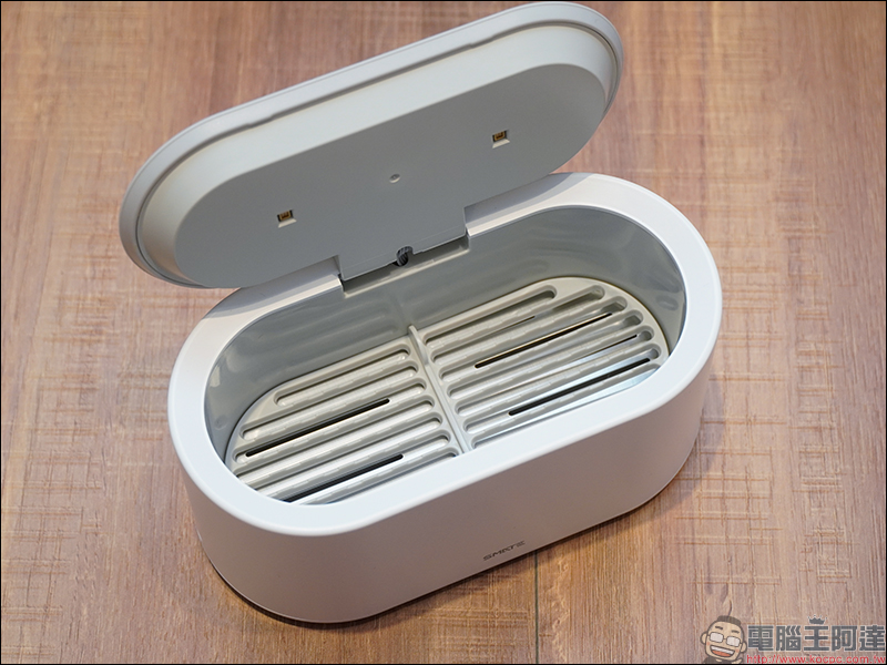 由於手錶分為前後雙面,加上紫外線消毒模式只需要短短 5 分鐘時間,雖然單次的紫外線消毒已經足夠達成殺菌效果,不過筆者個人還是習慣輪流為雙面都進行消毒。首先將錶背朝上能直接照射到消毒器內的紫外線燈,右側則擺放稍早卸下的錶帶: