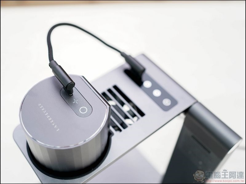 使用前只要將蜂鳥雷雕機本體放在升降支架上,接上電源即可。蜂鳥雷雕機使用相當省電,阿達實測接上行動電源(20000mAh)連續用了十幾個小時也不過使用不到一半的電量,連變壓器都不太需要帶:
