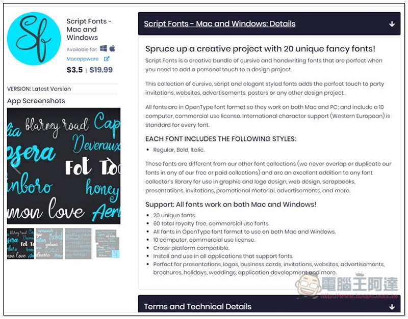 Script Fonts 是一套提供字型的軟體,共有 20 個獨特字型和 60 個可商用的字型,支援 Windows 和 Mac,原價 19.99 美金,同捆價僅 3.5 美金:
