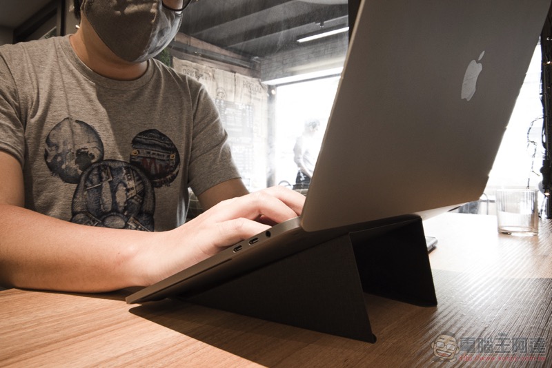 而且因為材質有防滑皮革也有一定厚度的關係,所以除非是太重的筆電,不然直接靠到皮革片的上緣,基本上就可以撐住筆電不要下滑了: