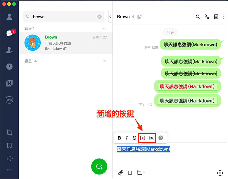 LINE 電腦版可使用粗體、斜體、刪除線、紅字框與段落框等五種聊天訊息強調顯示效果,更新後,反白文字時浮動顯示的選單新增裡兩個按鍵,共五種訊息強調顯示都有對應的按鍵: