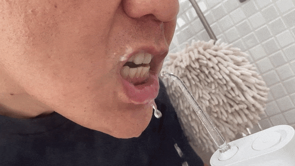 使用時只要將靜白水牙刷含入口中,依序沖刷每顆牙齒與牙齦間的縫隙即可(為了示意才張口噴,正常是閉口含著在口中移動清潔):