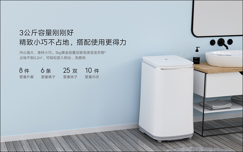 針對家中有嬰兒、孩童的家庭,由於嬰幼兒抵抗力弱、肌膚更敏感,衣物清潔和殺菌更是重要。因此這次米家也推出「米家全自動迷你波輪洗衣機 3kg」,雖然容積只有 3 公斤,不過這款產品其實是針對嬰幼兒衣物打造的專屬洗衣機產品。