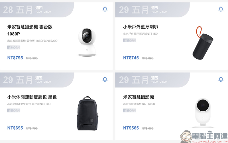 至於 5 月 28 日的每日精選商品則有 AMAZFIT 智慧運動手錶 2 折價 500 元只要 4,495 元(原價 4,995 元)、米家智慧攝影機雲台版 1080P 折價 200 元只要 795 元(原價 995 元)。 5 月 29 日每日精選商品為小米休閒運動雙肩包黑色折價 100 元只要 695 元(原價 795 元)、米家智慧攝影機折價 100 元只要 565 元(原價 665 元)。