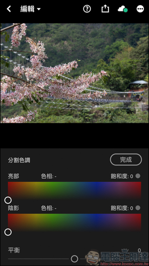 調整方式非常簡單,只要在顏色區域滑動就行了,這三張照片分別為亮部調整、陰影調整、平衡 ,在亮部及陰影部份可以選擇喜歡的色相和飽和度多寡,可以看出在調整過後,顏色已經有所謂濾鏡的效果:
