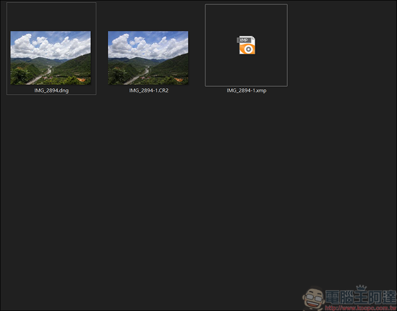 兩者轉出來的檔案就會像這樣,DNG為單獨的檔案(20.1MB),而RAW檔(22.6MB)則會附帶一個xmp副檔名的中繼資料。在電腦檔案瀏覽時可以看到DNG已經是調整好數值的縮圖,RAW檔則是最原始的狀態: