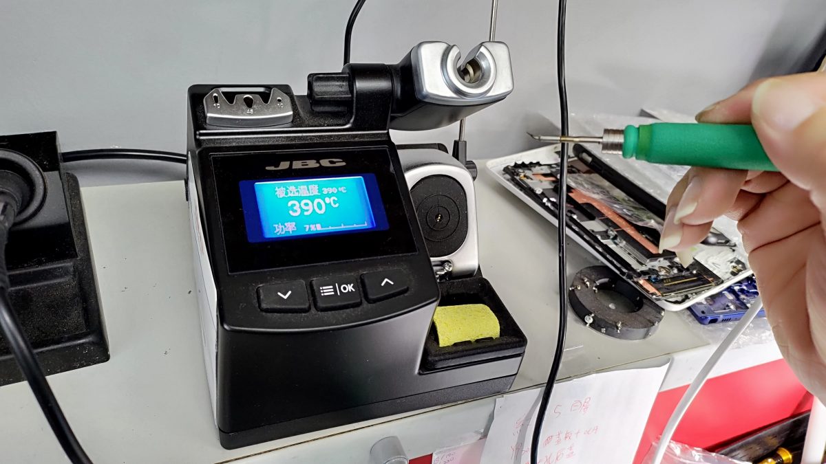 這次找的強者我朋友本身是做手機主機板維修的手機行老闆,光是他的設備就很驚人,這組JBC的烙鐵機就要價1萬多塊,不僅能溫度可調,快速升溫,烙鐵頭也是極細型的,必竟這是專門用來焊燒手機主機板用的,果然找專業的處理當然比較放心。