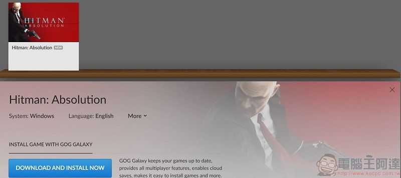 從網頁的個人頁面,若想下載《刺客任務:赦免》進行安裝,會有透過「GOG GALAXY」客戶端與下載安裝包兩種,建議使用「GOG GALAXY」較便於安裝且能管理下載遊戲。只要在《刺客任務:赦免》頁面點選「DOWNLOAD AND INSTALL NOW」,就會下載「GOG GALAXY」端安裝檔,並能在登入後安裝《刺客任務:赦免》。