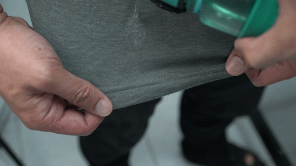 外層的布料使用80%聚酯纖維+20%的天然棉織成,並在外層採用斜桶單面印刷奈米薄膜的技術,可達到外層的輕防潑.抗醬料的功能,但仍保留內層極佳的吸濕排汗效果,官方也表示這層薄膜可耐受20次以上的反覆洗滌,防潑效果依然良好: