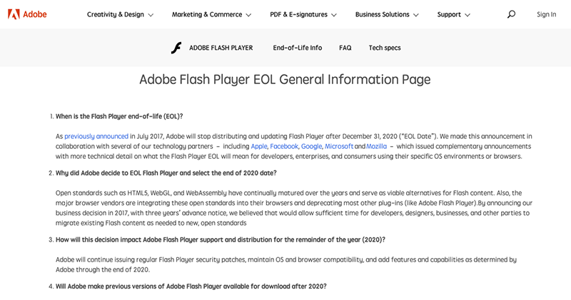 到了約定的那一天,使用者將再也無法下載到 Adobe Flash 也不再會有安全性更新。假若電腦中仍有安裝 Flash 支援元件的話,Adobe 接下來也會提示記得要解除安裝。假若你有很多 Flash 相關的資源需要存下的話,記得也要好好打包一下了。