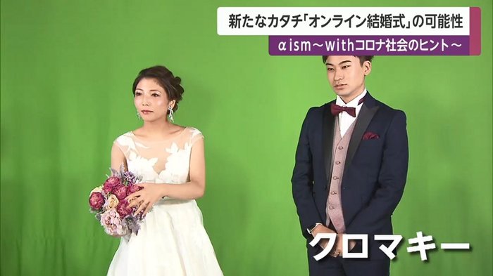 而上面這個線上婚禮算是正常版,FNN 前幾天更報導一個超特別版,還結合 CG 即時合成實景的效果,有夠高科技。