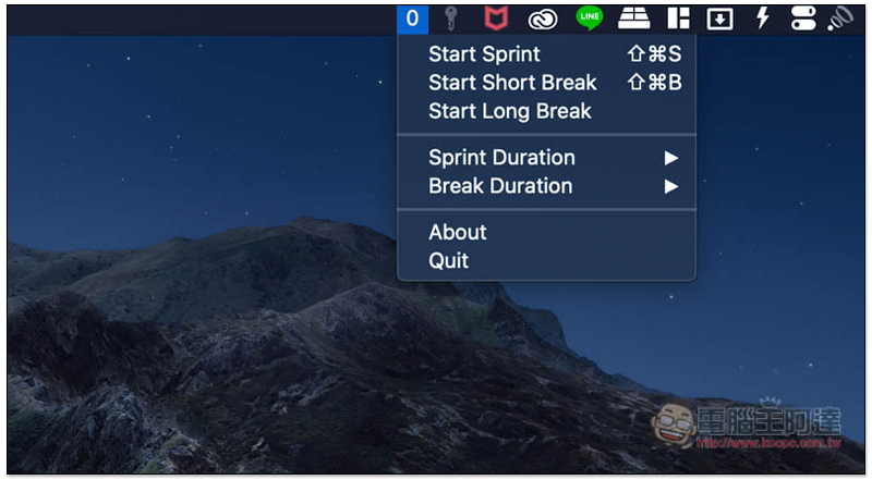 右上角 Menu Bar 就會看到這款工具(數字 0 的圖示),點擊打開選單,即可選擇你要開始工作(Start Sprint)、開始短休息(Start Short Break)、還是(Start Long Break):