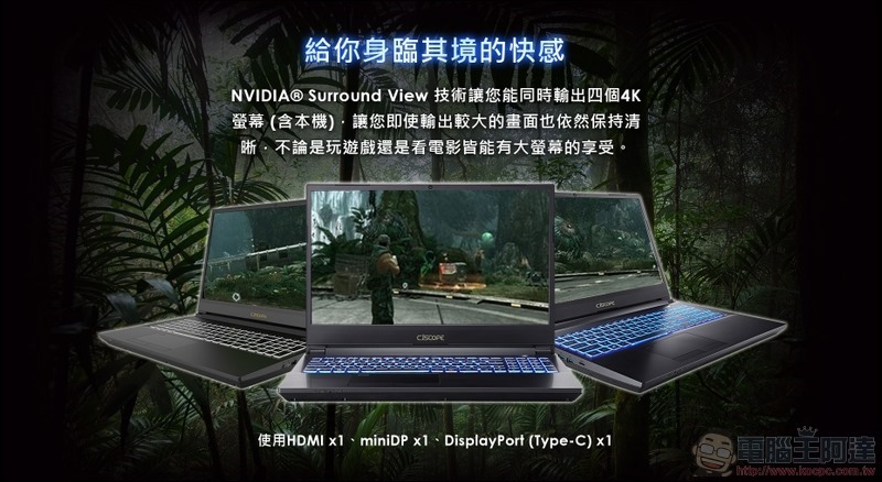 也因為有三個視訊孔位,透過NVIDIA Surround View技術,讓玩家可以同時擁有四個螢幕做使用(含本體),非常便利。