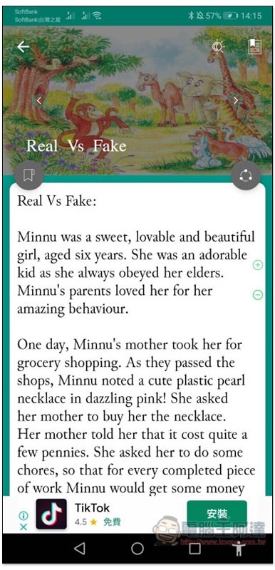 點入之後就可以開始閱讀,小可惜是目前還不支援朗讀,如果有就更棒了。不過如果你真的想改用聽的,也可以下載一些朗讀 Apps,Google Play 有不少,每本故事內容都能全選複製: