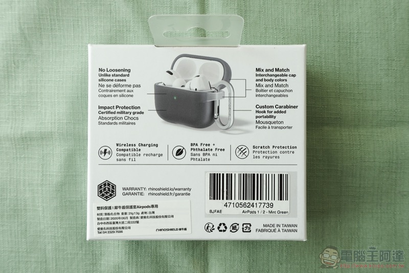 你可以用 NT$490(AirPods 1 & 2)/ NT$550(AirPods Pro)的價位買到犀牛盾具備 MIL-STD 810G 軍規防摔的 AirPods 保護殼,並能用每個 NT$60 的售價(原價 NT$100)額外多單買上蓋做搭配使用。