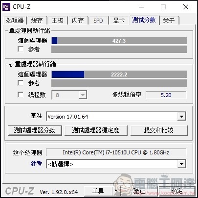 首先以CPU-Z進行核心效能測試,單核的分數為427.3,而在全核心的分數則是可以跑到2222.2。