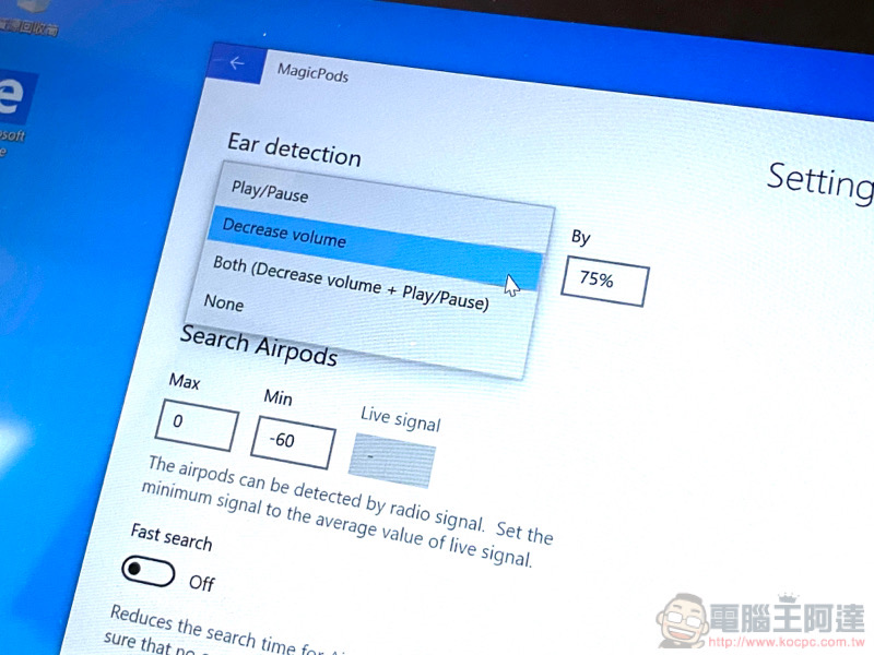 自訂功能的部分,主要可以針對摘下耳機的對應動作進行選擇。而除了 iOS 預設的暫停音樂外,MagicPods 還貼心提供了降低音量的選項。也可以自訂降低音量的程度(反應蠻快的)。整體而言,這個應用雖然並不算全然複製了 Apple 的體驗,不過也有提供額外的自訂細部選項(像是藍牙訊號要多高才會彈出偵測畫面)。這也算是現階段 AirPods 想要配合 Windows 系統的首選應用了。雖然要付費,不過如果你真的非得要在這個系統配合 AirPods 使用的話,那麼還是推薦各位可以嘗試看看,其實還不錯用啦!