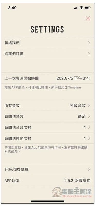 設定選單可調整音效設置、次數、以及查看你上一次專注開始時間: