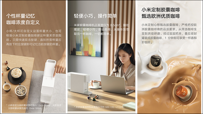 米家膠囊咖啡機的機身正面寬僅有 8.5 公分,即便擺放在桌面上也不佔空間。米家膠囊咖啡機可自定義大小杯的杯量,也可根據小米定制膠囊咖啡建議杯來萃取咖啡,並能記憶當前杯量在下次直接採用。小米定制精選膠囊咖啡,甄選歐洲優質咖啡,從篩選咖啡生豆到烘焙研磨都經過層層把關。