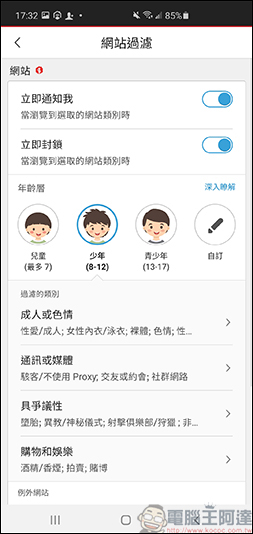 除了快速斷網以外,也可以設定網站過濾、不當應用程式、時間管理、連線通知..等, 在網站過濾設定裡,可以設定小孩的年齡,設定完之後系統就會自動建議過濾的類別,你也可以自行設定哪一些是要封鎖的,此外當小孩執行或搜尋敏感字眼的通知時,也可以設定立即封鎖及通知,可以更準確的掌握小孩上網的情形: