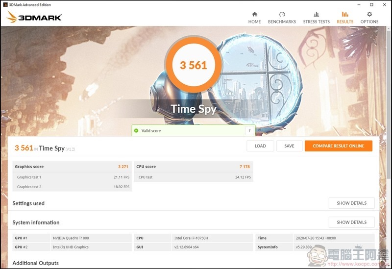 接著進行GPU的效能測試,小編使用3DMARK進行一系列的跑分,使用DirectX 12為核心架構的Time Spy測試,分數為3561。