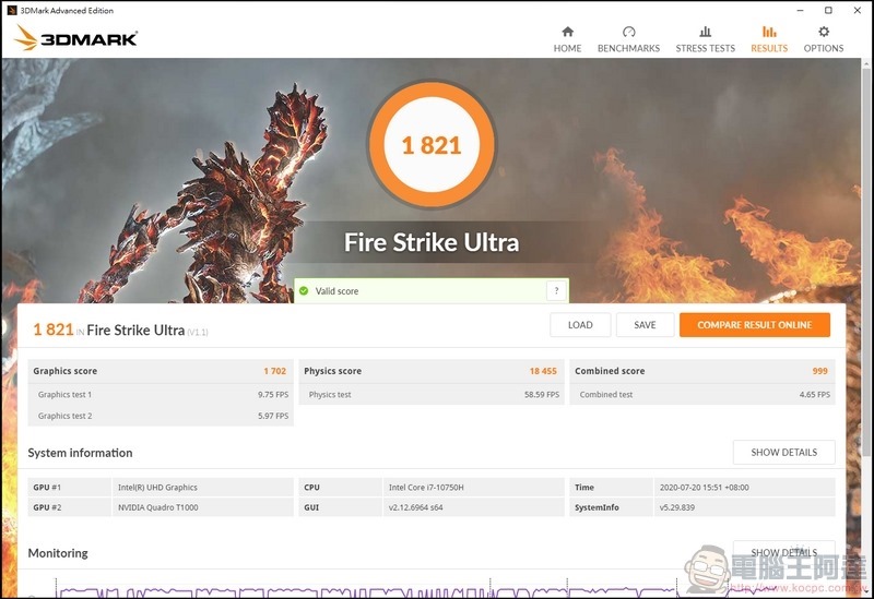 最後則是針對4K解析度的Fire Strike Ultra測試,Precision 7550的分數為1821。