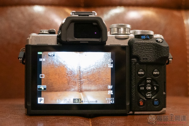 Olympus 也強調針對握持感方面,加強中指擺放的位置。此外,因應下翻自拍螢幕的改變,更巧妙地在螢幕空出的凹槽加入更順手的蒙皮包覆,使自拍更好掌握與控制。