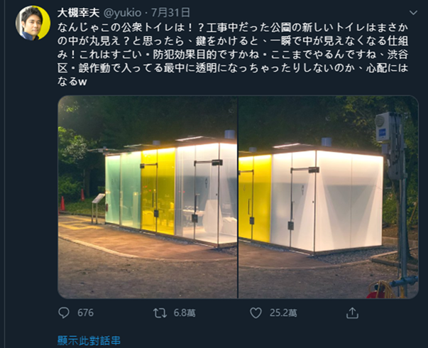 近日日本一位 Yukio 的 Twitter 用戶,於個人動態牆上分享目前正在施工的全新公共廁所,地點位於東京涉谷某處公園。根據他的說明,有人使用的情況下(門鎖起來),就跟一般廁所一樣,無論內外都看不到,但打開無人使用時,就會變成透明: