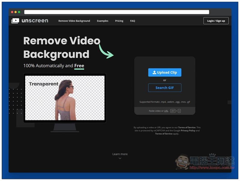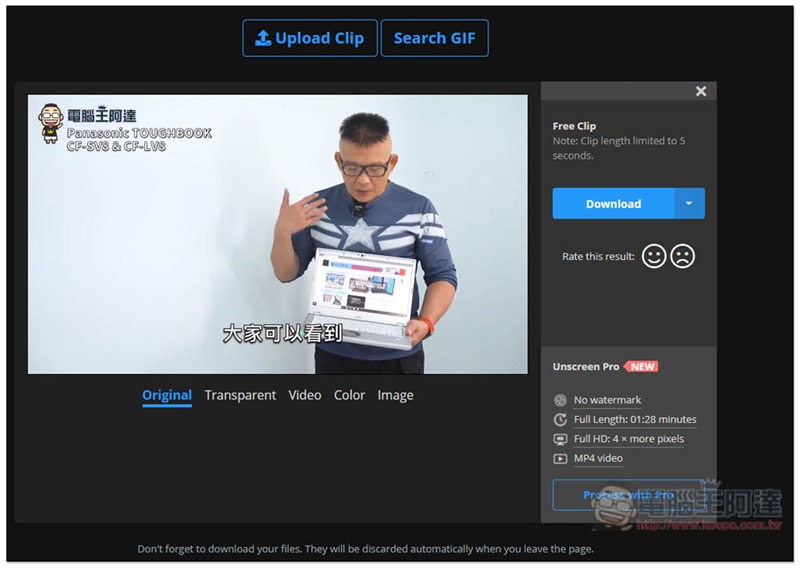點我進到 Remove Video Background 網站後,按右側的 Upload Clip 來選擇要上傳的去背影片,支援 MP4、Webm、OGG、MOV、GIF 格式,不想上傳自己影片的人,也能點擊 Search GIF 使用 GIPHY 的 GIF 圖片試試: