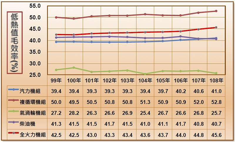 註五:毛熱效率:本公司為配合政府穩定供電政策,協助國家經濟發展,創造台灣優質投資環境,各火力電廠機組皆兢兢業業地營運,以求降低發電成本及穩定供電,優先以成本較低之台電燃煤基載機組供應系統所需電力,再以成本較高之燃油及燃氣的中尖載機組供電,中尖載機組也提供用電需求變化的變動負載;同時致力提高機組效率,逐步汰舊改建為高效率新機組或進行設備改善,108年為45.6%,為歷年來最佳狀況。台電網站。