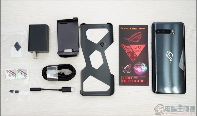 全部掏出來看看,ROG Phone 3 所有配件包括了手機、ROG小卡片、保護殼、AeroActive3 散熱風扇、變壓器、還有質感不錯的編織材質傳輸線與免費提供的 3.5mm 轉 USB 連接埠轉接線,華碩也貼心的給了兩組側邊接口的防塵塞:
